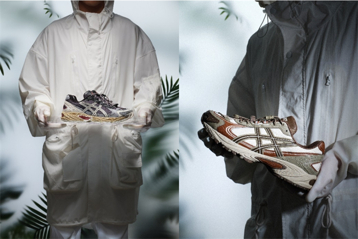 其中,灰蓝配色以“棒锤树属”为蓝图,融合花朵的红色点缀鞋身;黑棕配色自园丁黑色的围裙汲取灵感,直面匠心所在;白绿配色将“白肌”的绿色叶片与枝干的棕白写意呈现;棕红配色则来自于UV灯下块茎植物所呈现温暖色彩。此外,全系列鞋后跟立体压印设计皆融入了块茎植物“龟甲龙”的茎干龟裂纹理,再添旷野线索。